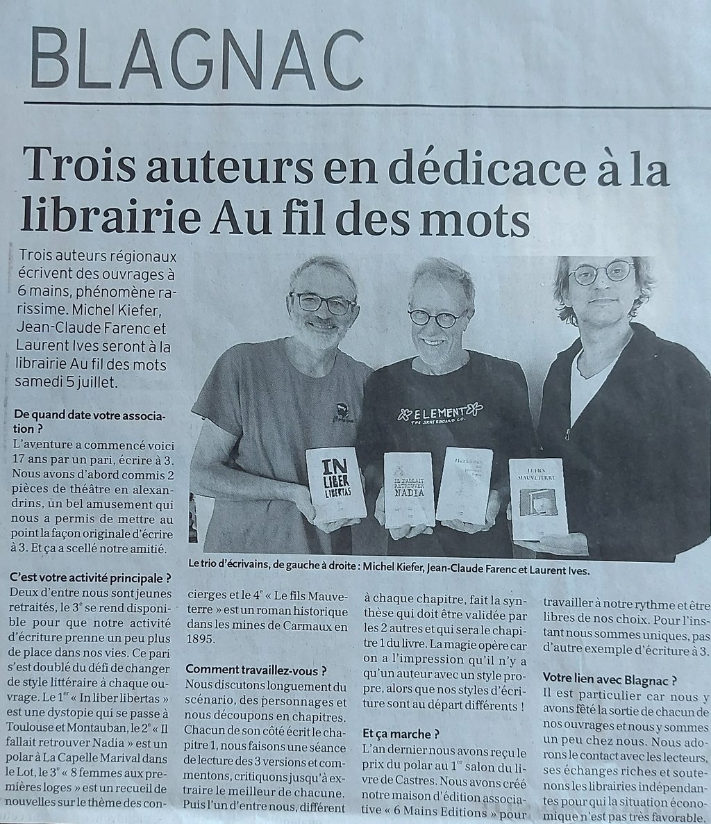 Créée fin 2018, 6 MAINS EDITIONS publie les romans et les nouvelles coécrits par les trois auteurs toulousains : Jean-Claude Farenc, Laurent Ives et Michel Kiefer.
